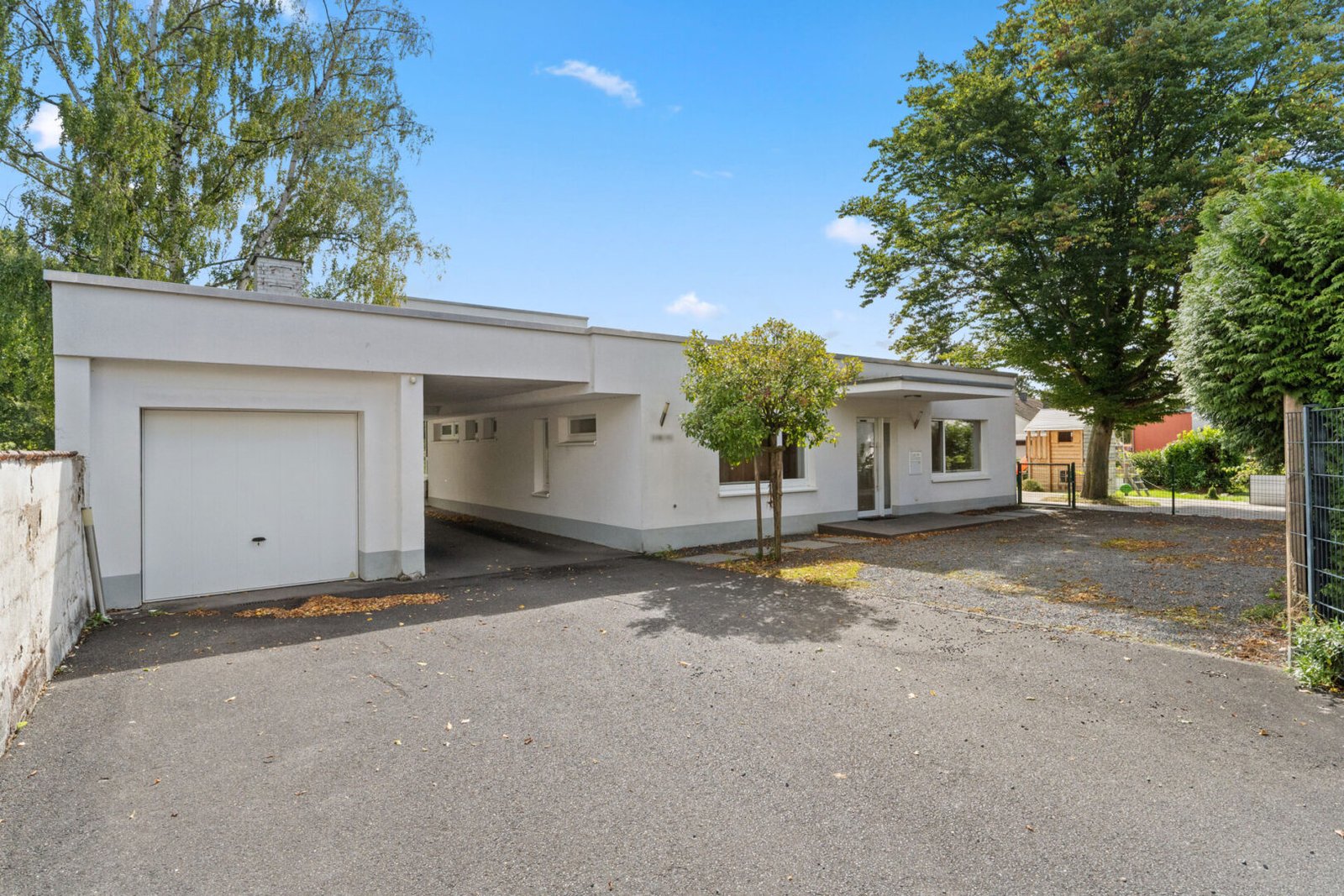 Vor dem Haus ist Platz für 2-3 Fahrzeuge, es gehört jedoch auch eine Garage dazu. Anschließend an die Garage befindet sich ein Fahrradraum. In diesem ist auch die Luft-Wärmepumpe und der Warmwasserspeicher.