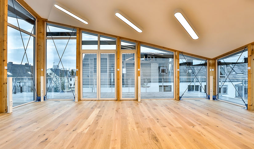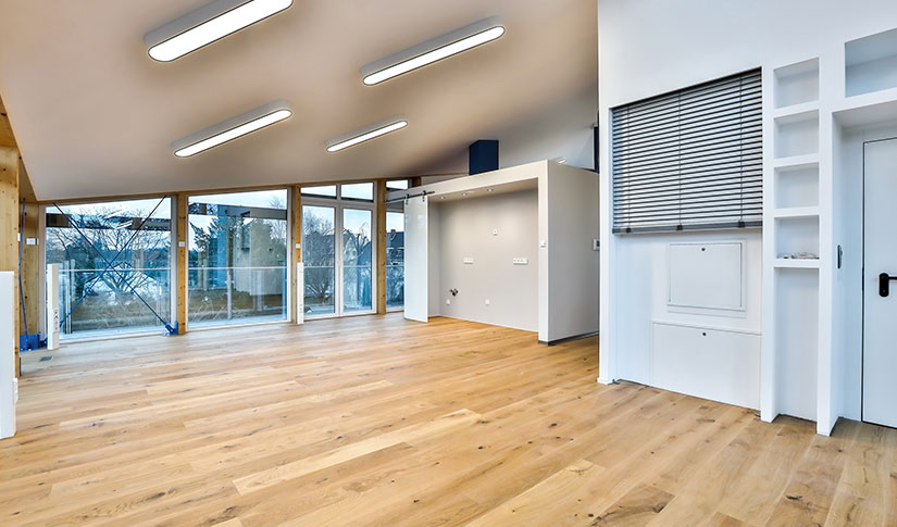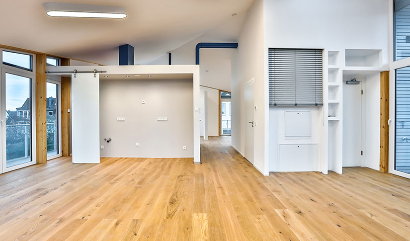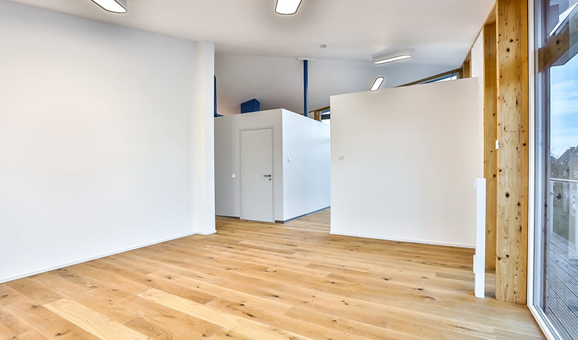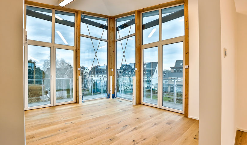 Highlight des Penthouses sind die großen Fensterfronten, die hohen Decken und der wunderschöne ums Haus gelegene Balkon.
