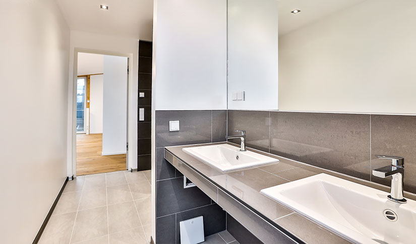Durch den Flur kommt man in das großzügige Badezimmer als auch in das Schlafzimmer und ein mögliches Arbeitszimmer.